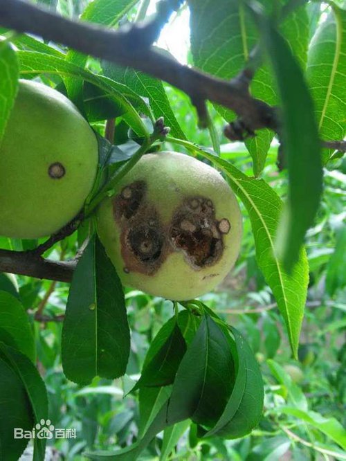 果实:幼果果面呈暗褐色,发育停滞,萎缩硬化。稍大的果实发病,初生淡褐色水渍状斑点,逐渐扩大,呈红褐色,圆形或椭圆形,显著凹陷。后在病斑上有橘红色的小粒点长出。