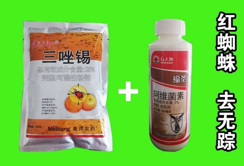 (3)生长期喷药防治苹果发芽后至花序分离期是防治越冬雌成螨的关键期,苹果落花后10天左右至20天左右是喷药防治第1代幼螨、若螨的关键期;以后在害螨发生数量快速增长初期进行喷药,还需喷药1-2次,间隔期1个月左右。用益农的美邦三唑锡加红太阳阿维菌素效果极佳。